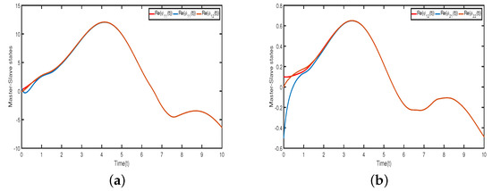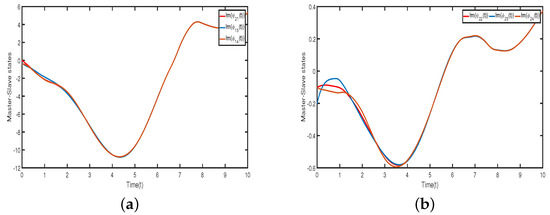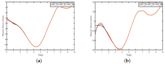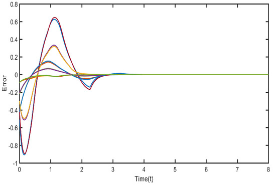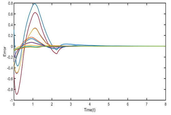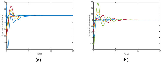 Therefore, according to the Assumptions 1–4 and Theorem 1, the conditions obtained indicate the feasible solutions are . Figure 6 and Figure 7 illustrate, that neurons in each cluster can synchronize with their target neurons in a finite amount of time, while under the adaptive controller, synchronization among various clusters is not achievable. Figure 8 and Figure 9 displays the trajectories of the CS errors.