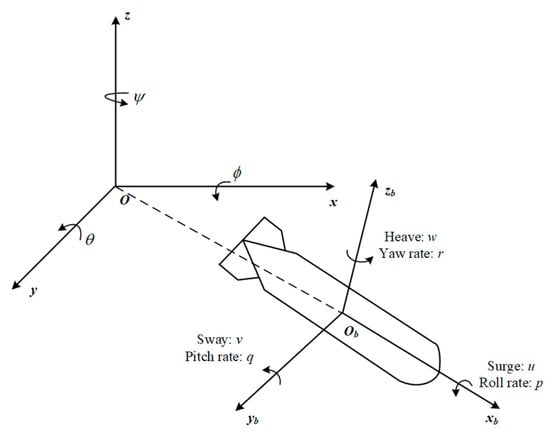 Six degrees of freedom motion equations of AUV can be described using the earth-fixed coordinate system and body-fixed coordinate system shown in Figure 1, both of which are right-handed. The earth-fixed coordinate system has its origin fixed to the earth, and the body-fixed coordinate system is a moving reference frame with its origin fixed to AUV center of buoyancy.