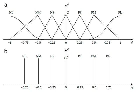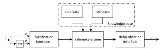 A fuzzy logic controller has four components: knowledge base, inference engine, fuzzification interface, and defuzzification interface []. The basic structure of a two-dimensional fuzzy logic controller is described as in Figure 2, where the continuous input signal, and , convert to the membership degree vector of the fuzzy variables through a fuzzification interface, the inference engine carries out rule inference and actual output signal is obtained through defuzzification interface. The data base denotes membership functions of the total input and output variables and the rule base is performed using a collection of fuzzy if–then rules by expert experience, both of which make up the knowledge base.