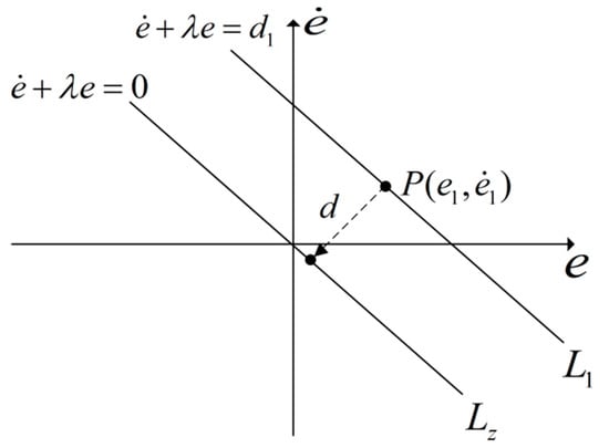 Typically, a fuzzy logic controller has two control inputs, namely error and its derivative . It is common for its rule table to have the same output membership in a diagonal direction, something known as the Toeplitz structure, as shown in Table 1 []. In addition, each position on a diagonal line has the same distance from the main diagonal line of rule table. Thus, instead of using two-variable input sets , the corresponding control output can be obtained using the distance between input signal and the main diagonal line. This finding was first proposed by Choi et al. and is known as the signed distance method []. To derive the distance, , a two-dimensional space of and is established as shown in Figure 3.