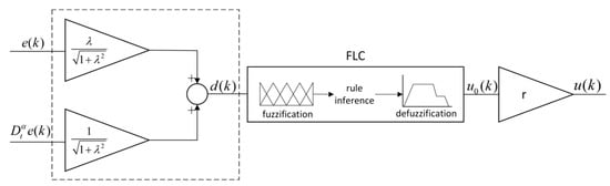 Based on the above analysis, the overall structure of SIFLC can be depicted as in Figure 4. The distance variable is obtained through linear combination of error signal and its fractional derivative, the inner fuzzy logic controller is single input single output (SISO) and the final output is obtained by multiplying with the scale factor, which is denoted as . We set to 1. Thus, in addition to the membership functions, there are two adjustable parameters in the SIFOFLC, namely and .