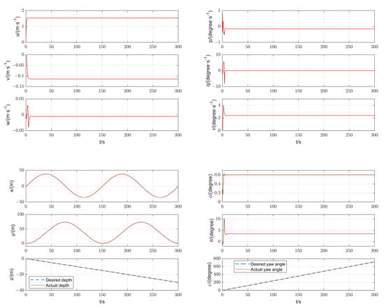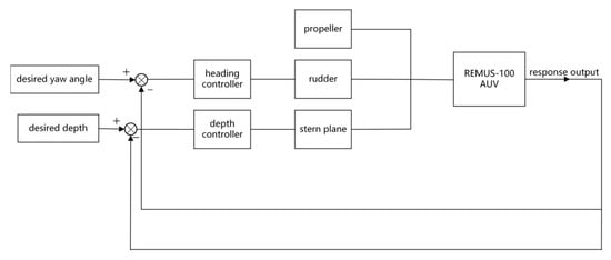 Figure 8 illustrates the block diagram of an AUV motion control system. The propeller speed is fixed at 1500 r/m so that the cruise speed maintains a constant value. In this case, the target trajectory is obtained with heading controller and depth controller.