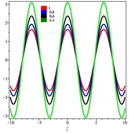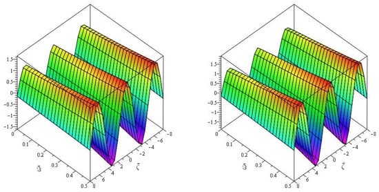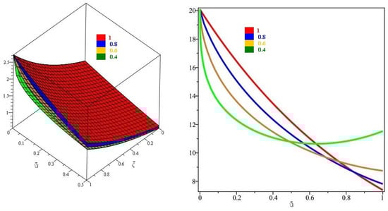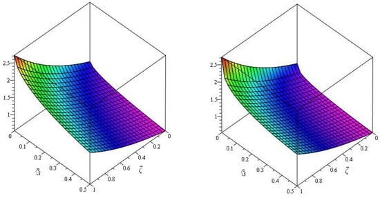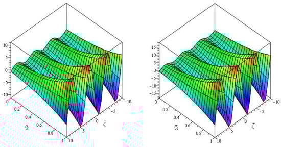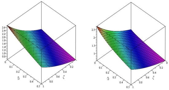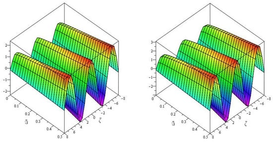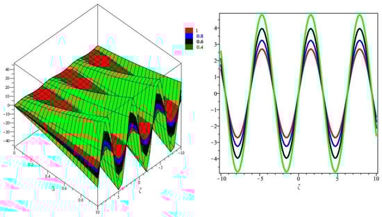 Figure 7, demonstrates the close agreement between the exact and approximate solutions, which is a fascinating amalgamation of Natural transform and Caputo–Fabrizio fractional derivative for real parts only. Furthermore, Figure 8, depicts the fractional order behaviour of the real part of when fractional order and , respectively. Figure 9, depicts the two-dimensional representation of various fractional-order of of Example 3.