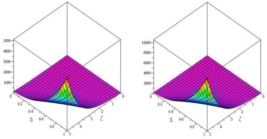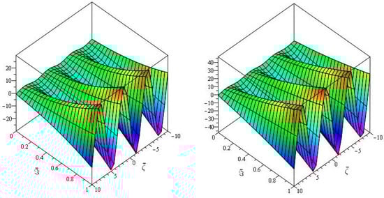 Figure 10, demonstrates the close agreement between the exact and approximate solutions, which is a fascinating amalgamation of Natural transform and Caputo–Fabrizio fractional derivative for real parts only. Furthermore, Figure 11, depicts the fractional order behaviour of the real part of when fractional order and , respectively of Example 4.