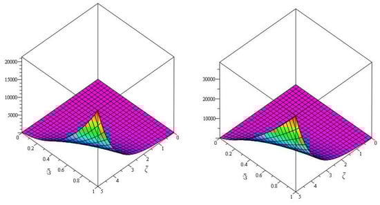 Figure 4, demonstrates the close agreement between the exact and approximate solutions, which is a fascinating amalgamation of Natural transform and Caputo–Fabrizio fractional derivative for real parts only. Furthermore, Figure 5, depicts the fractional order behaviour of the real part of when fractional order and , respectively. Figure 6, illustrates the three- and two-dimensional representations of various fractional-order of . Table 2 shows that the comparison with the caputo and Caputo–Fabrizo operators.