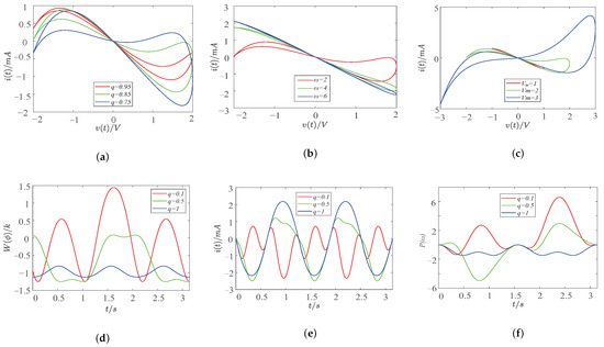 From above, Figure 1a shows the alter of the area of the hysteresis loop when the order q of Equation (12) is changed; Figure 1b illustrates how the area of the hysteresis loop changes when the frequency is altered, and, when the increment is large enough, it becomes a single-valued function; Figure 1c shows that there is a positive correlation between the variation in the excitation voltage amplitude at the memristor terminal and the area of the hysteresis loop. Then, in the subsequent group, Figure 1d is the effect of order on the memristor, and the memristance will be positive or negative. When the fractional-order memristor degenerates to integer-order, it is found that the integer-order memristance is always negative; Figure 1e demonstrates that the dynamic range of the current memristor variation increases with a decreasing order; Figure 1f is the time-domain waveform of the memristor output power, and when the order changes, the memristor power changes between positive and negative. When the fractional-order memristor degenerates into an integer-order, the integer-order memristor power is always less than zero.