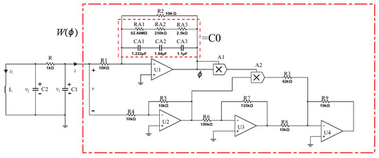 Accordingly, from Lemma 1, , i.e., , which satisfies Equation (33), occurs when the system is at zero equilibrium O. As a result, the system with can gradually stabilize to the equilibrium, and the fractional-order memristor feedback control circuit is designed as shown in Figure 18.
