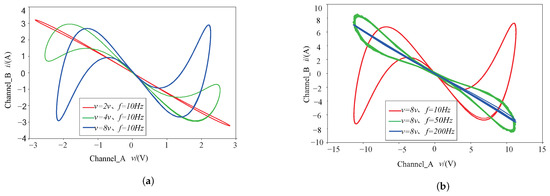 Figure 3a shows that the voltage excited by sinusoidal voltages has not changed, but the frequencies have changed: this is a “hard” switching condition (large voltage excursions or long-term bias), and any symmetrical AC voltage bias will cause double-loop hysteresis and shrink to a line at high frequency (blue line) as long as it remains in the memristor mechanism. Figure 3b shows that the frequencies have not changed and that the voltages have changed, and as the voltage decreases, the hysteresis loop of the memristor tends to be linear.