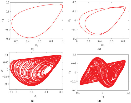 where . Based on this approximate analytical solution, the parameter f is selected as the system variable. The others parameter values are , , , , , , and the initial condition . By changing the parameter f, the system phase diagram of Figure 4 can be obtained.