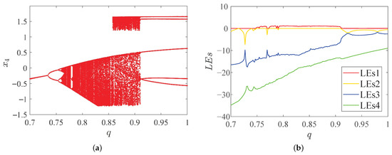 Dynamical behaviors with fractional orders q of system (15). (a) Bifurcation diagram; (b) LEs.