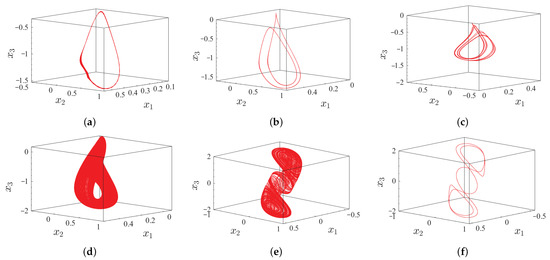 Phase diagrams of system (15) in plane. (a) Period-1 of ; (b) period-2 of ; (c) period-4 of ; (d) single-scroll attractor of ; (e) double-scroll chaotic attractor of ; (f) period-2 of .