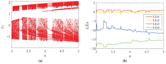 We fixed the order , the parameter a is used as a variable and selected the system parameters as , the initial value as , similarly. Then we obtained the bifurcation diagram and LEs diagram as show in Figure 7.