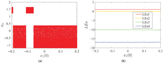 Dynamical behaviors with changes in initial value of system (15). (a) Bifurcation diagram; (b) LEs.