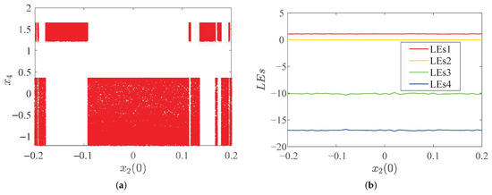 Under the same parameters and conditions as the above analysis, is selected as the variable, and the bifurcation diagram and LEs diagram are shown in Figure 9.