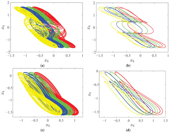 Time-domain waveforms of state variables of the system (28). (a) plane; (b) plane; (c) plane; (d) plane.
