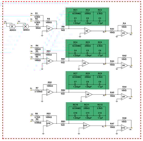 The analog circuit was designed as shown in Figure 15 in order to verify that the system (15) is functioning correctly. Multiplication was implemented by the AD633 multiplier, and the integral and addition operational amplifiers were implemented by TL082. All of the chips needed in the circuit were powered by V DC.