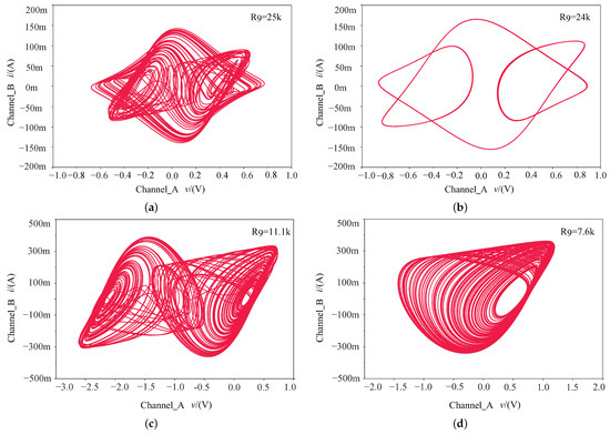 Circuit simulation under different resistances in plane. (a) Single-scroll periodic-1 limit cycle with k; (b) single-scroll periodic-2 limit cycle with k; (c) single-scroll chaotic attractor with k; (d) symmetric single-scroll chaotic attractor with k.