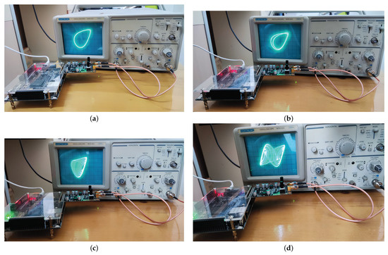 The selected system’s parameters are consistent with those of the aforementioned dynamics study: the step is , and the initial value is . The FPGA digital circuit of the system (15) was realized using the FPGA chip EPLC6Q240 of the Altera Cyclone4 series. To capture the system’s phase diagram on the digital oscilloscope, the only change was to the system parameter f, as shown in Figure 17.