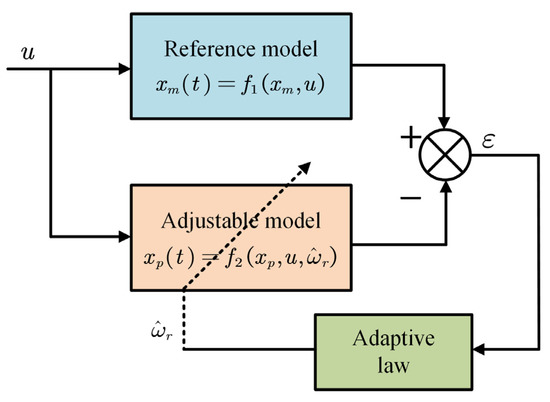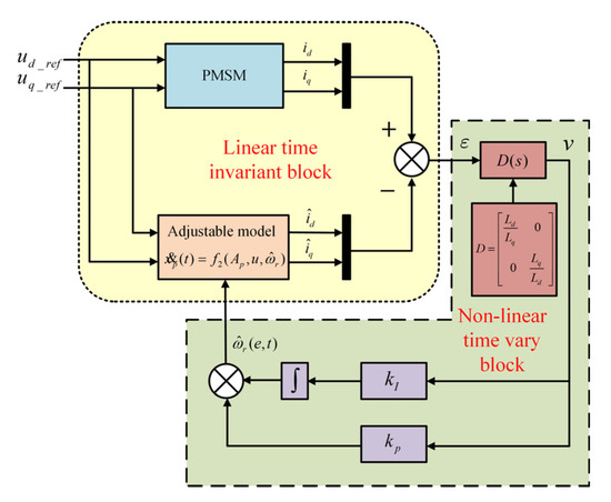 The block diagram of the speed-estimation-based MRAO is shown in Figure 1. This method contains two different models (i.e., the reference model and the adjustable model). The error between the two models is used to estimate unknown parameters. There are two kinds of observer based on the input signal of two models: one is the current observer and the other is the flux observer. Each of these observers’ adjustable models relies on the unknown parameters of PMSM (in this paper the unknown parameter is estimative rotor velocity (). Contrary to the adjustable model, the reference model should be independent of the speed. The output of the adaptation mechanism is the estimated quantity, which is used for the tuning in the adjustable model and also for feedback. The stability of such a closed loop estimator is achieved through Popov’s hyperstability criterion [11]. The method is simple and requires less computation.