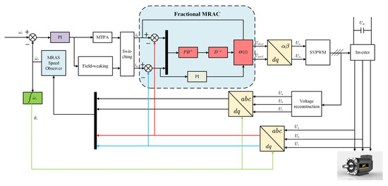 Reference [26] uses model reference adaptive control, but the accuracy of this method depends on the accuracy of the motor parameters. Reference [27] adds sliding mode link to the speed ring to improve the robustness of the system. In reference [28], the complex domain is used to define the motor stator current for the adaptation mechanism of the adaptive algorithm, and the adaptive algorithm under complex values is written for the PI gain controller and the rotation speed is estimated, but it is only applied to the induction motor. Regarding the comparison of different speed observers for the vector control PMSM drive, the sliding mode observer (SMO) and the model reference adaptive system (MRAS), a comprehensive analysis of SMO and MRAS considering dynamic, steady-state performance and robustness as well as affectability, stability, and computational complexity was conducted in [29]. Besides, this study optimized the traditional MRAS and sensorless control theory, but only added a partial active anti-disturbance control, with poor robustness and optimization degree improvement. A novel fractional order adaptive sliding mode controller (FOASMC) was designed to realize the speed control of a permanent-magnet synchronous motor (PMSM) with matched model uncertainties and load disturbances in [30], but its algorithm is only applicable to the variable flux motor with combined magnetic poles. Therefore, the fractional order model reference adaptive controller is rarely applied in the field of motor control, which is not only related to its own limitations, but also related to people’s lack of understanding of fractional order motors.