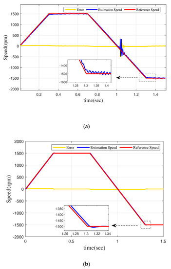 For the design of dynamic characteristics, the dynamic process in Table 1 is used: First, the reference speed increases from 0 to 1500 rpm within 0~0.3 s without load torque; after maintaining stable operation for 0.4 s, the motor reverses, the motor speed runs from 1500 rpm to −1500 rpm within 0.7–1.3 s, and the motor finally maintains steady operation within 0.2 s. For the dynamic process, numerical simulation was carried out under the condition that the PMSM has a new controller and no new controller for the model reference adaptive observer. Figure 5a shows the running speed curve of the PMSM with PID and MRAO. Figure 5b is the speed curve of the PMSM when MRAO and FOMRAC are simultaneously connected. As can be seen from the figure, when the FOMRAC is not added, the observer will have a serious jitter phenomenon when the motor is running at high speed, and its error margin is about 25 rpm. However, after FOMRAC is added, the observer can also maintain a stable state when the motor is running at high speed, and the error fluctuation is reduced to 5 rpm. Moreover, at the point where the motor is switched from positive rotation to reverse rotation, the MRAO has a serious jitter phenomenon, which means that the motor cannot be observed when the speed is 0, but after the addition of FOMRAC, the motor can maintain stability at the point above 0 speed. The curves of the PMSM speed under the two conditions are as follows: