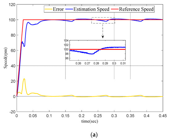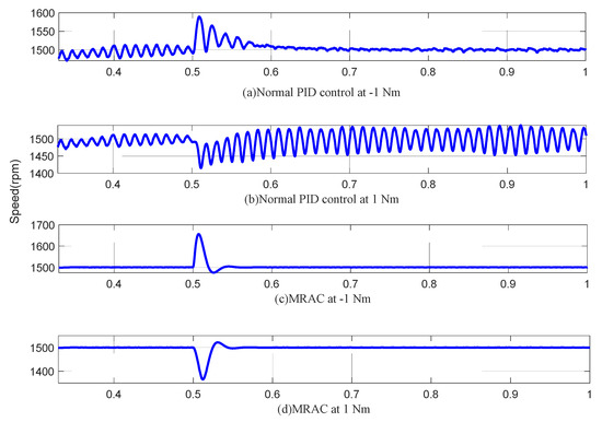 Figure 7a,b shows the steady-state speed curve of the PMSM only under the condition of PID and MRAO. It can be seen that after adding 1 N·m load torque, the speed fluctuation range is more than 100 rpm, and the speed stays at 1500 rpm after 0.6 s. However, after the load torque of −1N·m is added, the speed fluctuation still exceeds 100 rpm, and it cannot maintain stable operation under the action of −1 N·m torque.
