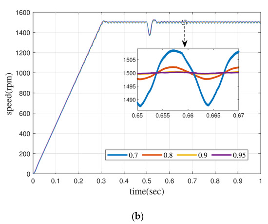 In order to enhance the comparability with or without a fractional order controller, eight kinds of fractional-order motors are introduced in the simulation experiment, which are 0.92, 0.93, 0.95, and 0.97 order permanent-magnet synchronous motors without a controller and 0.7, 0.8, 0.9, and 0.95 order permanent-magnet synchronous motors with a new controller. All permanent-magnet synchronous motors run under the condition of a model reference adaptive observer. The speed curves of fractional PMSM with different orders are shown in Figure 9.