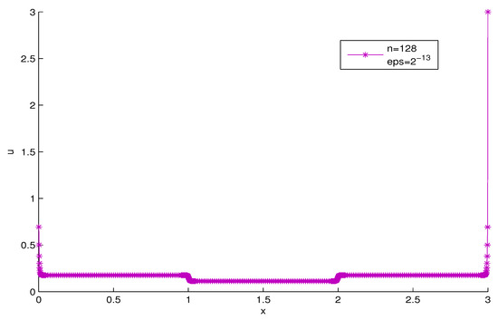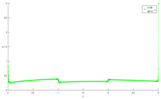 The continuous problem denoted by (2)–(4) displays strong inner layers (left and right) at and , as well as strong boundary layers at and . In order to create three piecewise uniform Shishkin meshes, the interval is divided as follows , where the transitional parameter