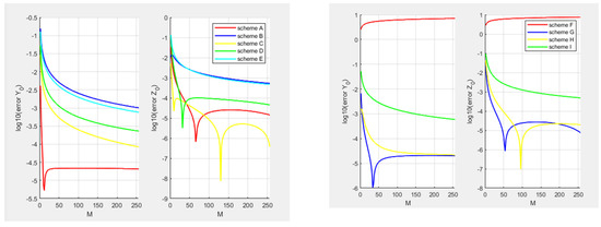 In order to show the performance of the generalized -scheme, we also solve the BSDE by the generalized -scheme with different parameters for the time steps . In Figure 1, we graph the errors of the analytical and numerical solution and spacing fineness M. We find that with the increase in M, the closer the errors are to zero. The results show that the errors are convergent.