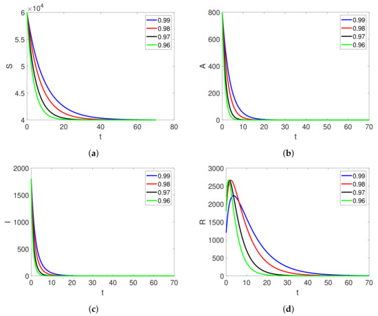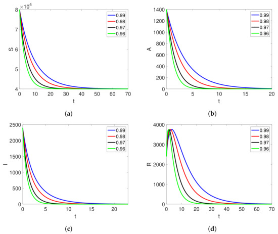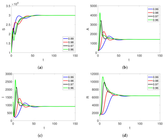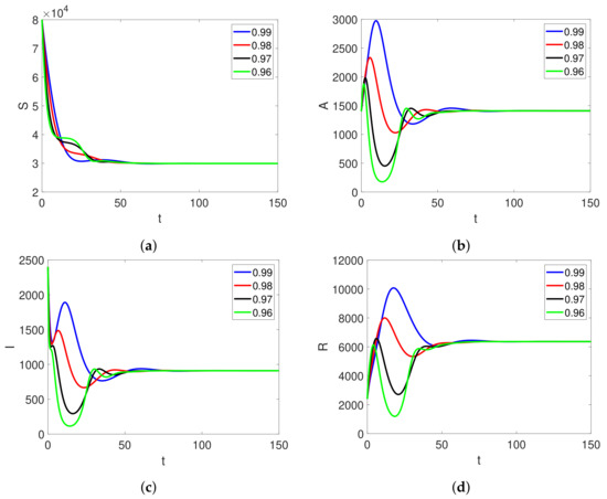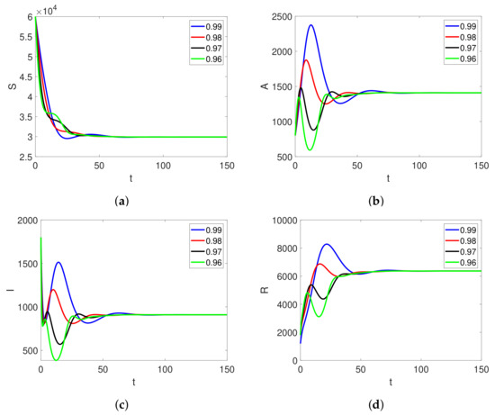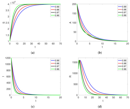 In Figure 1a, Figure 2a, Figure 3a, Figure 4a, Figure 5a, Figure 6a, the population behavior of the susceptible population is presented. We see in Figure 1a, Figure 2a, Figure 3a that when the value of ⋏ was large, there were oscillations in the behavior, which moved towards stability when . Further, Figure 1b, Figure 2b, Figure 3b, Figure 4b, Figure 5b, Figure 6b show the dynamics of the asymptomatic individuals, where it can be seen that the asymptomatic population increased as the time passed, while the individuals in this class became constant as at lower fractional orders. Similarly, Figure 1c, Figure 2c, Figure 3c, Figure 4c, Figure 5c, Figure 6c and Figure 1d, Figure 2d, Figure 3d, Figure 4d, Figure 5d, Figure 6d show the population dynamics in the infected and recovered individuals, respectively. From Figure 1c and Figure 2c, we observed that the infected population increased at the beginning, which showed a decrease as the time passed, while a fast decrease was observed in the infected population in Figure 3c, when the fractional order was . Further, the recovered population kept increasing and then became stable at , it was also observed that the recovered population was very large when compared to the those infected with the virus.