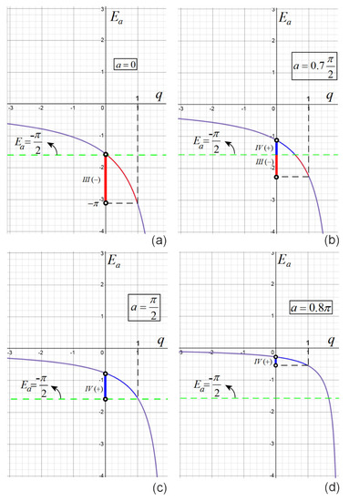 In order to determine in which quadrant the values of are situated, let us analyze and sketch the graph of the restriction of the function to . The derivative of is . Therefore, from the monotonicity, one deduces that decreases from , for , but to , for . For example, for the limit case of , takes values within the range , i.e., are situated in quadrant III (Figure 1a). For the case of , the values of can be situated in both quadrants III and IV (Figure 1b). For , moves within in the quadrant IV (Figure 1c). The case of is presented in Figure 1d. Therefore, for and , the argument can take values situated in quadrant III and/or IV, where could be either negative or positive.