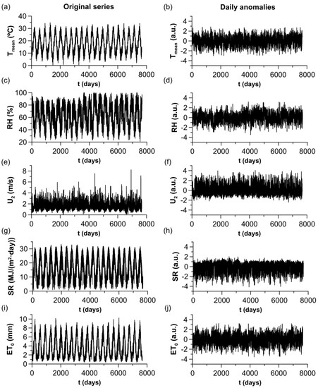 The agro-meteorological time series display seasonal trends (see Figure 1). Because periodicities can influence the analysis of nonlinear properties of time series [17,33], the seasonal component of these series must be eliminated before applying multifractal methods. For this purpose, the standardized anomalies of daily series were obtained using the following formula [16,34,35,36,37]: , where is the calendar mean and is the calendar standard deviation.
