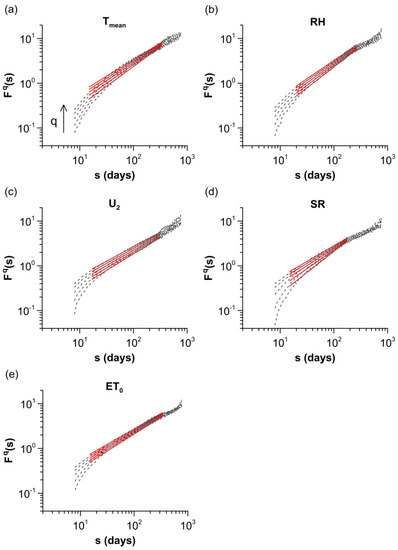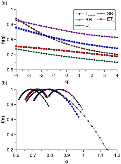 MFDFA was applied to all four meteorological variables and , considering a range of scales, , between 8 and days, with steps of 1 day, and values of between −4 and 4, with steps of 0.2. These values are similar to those used in previous studies [2,13,17,19].