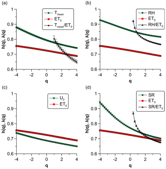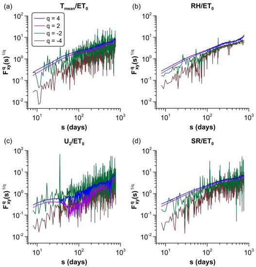 For the second-order moment, was approximately the average of the individual exponents, (see the small differences between both quantities, , in Table 3). However, for different values of , significantly deviated from for medium and relatively small fluctuations (Figure 6a,b,d) and for large fluctuations in the case of and (Figure 6a,d). This phenomenon has not been observed before in recent studies of the reference evapotranspiration, where multifractal correlation exponents stay within the range of the individual scaling exponents [17,19]. According to Oświȩcimka et al., the difference between and arises from distinct values of proportionality constants in the power law behavior of each process [25]. This fact suggests that the nature and dynamics of multifractality of the meteorological factors and differ considerably.