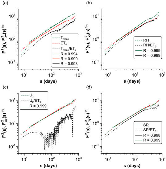 Log–log plots of the second-order covariance functions, , of each meteorological factor with and second-order variance functions, , obtained in the previous section, are shown together vs. the scale in Figure 5. Linear trends (solid lines) of and with scale can be noticed in Figure 5a,b,d, showing the power-law scaling of these functions. Correlation coefficients of linear fits for these curves can also be seen in this figure. Once again, the protocol of Makowiec and Fuliński was applied to the detrended cross-correlation functions to consider the scaling exponents as representatives of the scaling phenomenon [50].