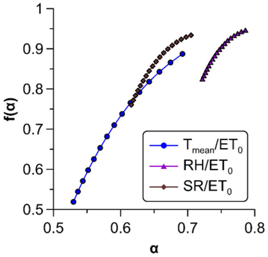 In Figure 3b, multifractal spectra of these variables are depicted. As can be seen in the figure, they are ordered from higher to lower value of (from right to left), where a lower value implies a less correlated signal (and one which has more complex small fluctuations). The width is much higher for the time series, again denoting a higher degree of multifractality for this variable. Additionally, the right tail of this spectrum indicates that small fluctuations of exhibit a fine structure which is characterized by the largest range of observed in these variables (see Table 2). Lastly, the AI suggests that all meteorological variables had slightly right-skewed spectra, where was noticeable by its clear asymmetric shape, whereas displayed an almost symmetric multifractal spectrum with a small deviation to a left-skewed spectrum. This means that the small fluctuations of the main controlling factors of had fine structure and were more complex, whereas those observed in reference evapotranspiration were more regular and homogeneous.
