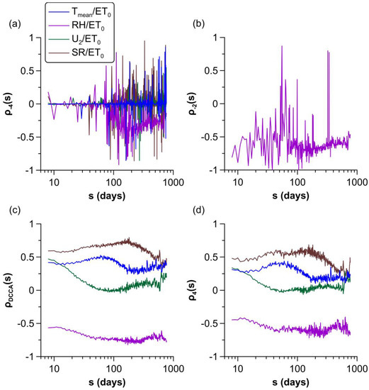 Medium-sized fluctuations, described by the standard DCCA coefficient , were weakly cross-correlated with all the analyzed meteorological factors for a wide range of scales, with the and being the most correlated ones. As was expected, the correlation between and was negative. Correlations were more stable and increased slightly with scale up to 60, 300, and 200 days (several months) for , , and , respectively. On the contrary, correlations slightly decreased with scale up to 50 days for , becoming negligible (see Figure 8c). For the first three variables, these bounds are closely related to the upper limits of the best scales where covariance functions fit well to power laws. From these boundaries, trends become more irregular and are inverted for large scales, except for , whose trend changes twice.