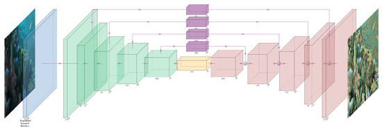 - Color Loss. To mitigate the color difference between pre-enhanced and post-enhanced underwater images, color loss was introduced into our model. The color loss function is defined by the angle between the input and output pixel vectors:where F denotes a pixel matrix transform, and represents a single pixel in the matrix. As distance is widely used in image-processing tasks, a disadvantage has shown that the norm only calculates the numerical difference between the pixels, but the directional difference of the pixel vectors cannot be measured. In the proposed model, the color loss aims to narrow the gap of the angle between pixel vectors but not introduce too much computational cost.
