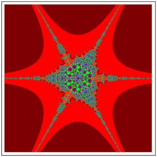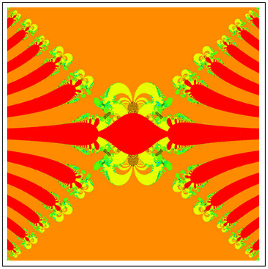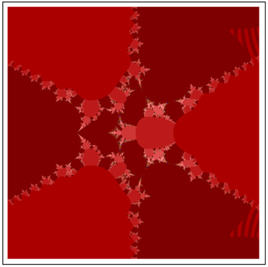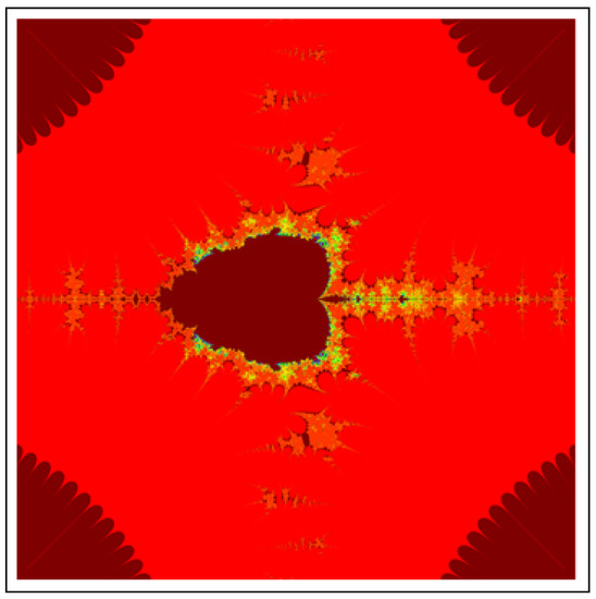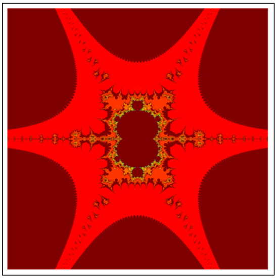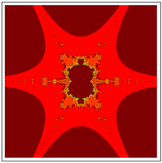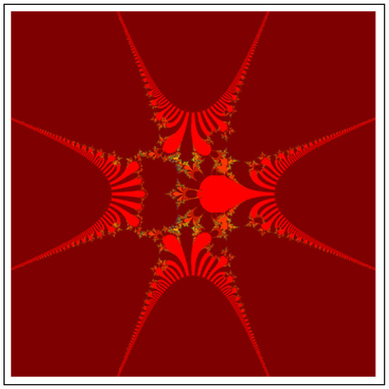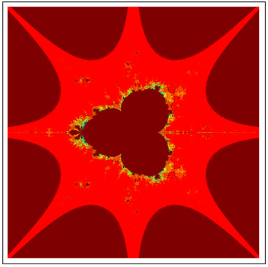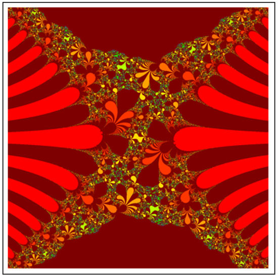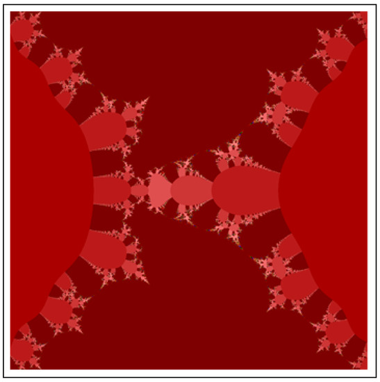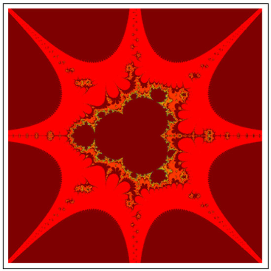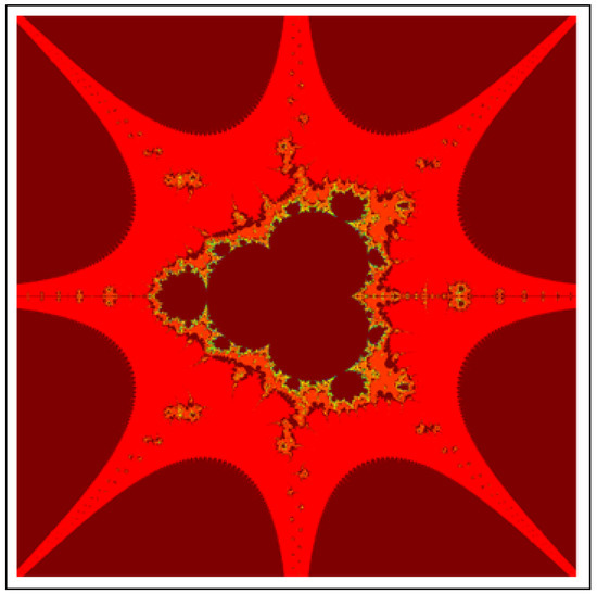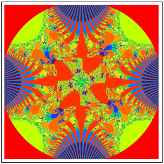 A fractal can be characterized as “a mathematical figure whose every point shows the same similarity as the entirety” or “an extremely irregular shape for which any appropriate focused part is like another larger or more modest part when amplified or diminished”. The word “fractal” is a Latin word that means broken or fractured. This terminology was first used by B. Mandelbrot [6] and later on he became famous as the “father of fractal geometry”. In the beginning of 20th century, P. Fatou and G. Julia tried to find the progressive estimate of where but they were unable to draw the graph of the proposed function. In 1985, B. Mandelbrot started work on this and successfully sketched the graph of complex function . He defined Mandelbrot set by changing the values of complex parameter b and variable x [7]. M-sets for where and are elaborated in [8]. The images like J-set and M-set using rational and transcendental complex functions are discussed in [9]. Later on anti J-sets and anti M-sets were defined by Crow et al. [10], and they generated graphs of where which are tri-corns.