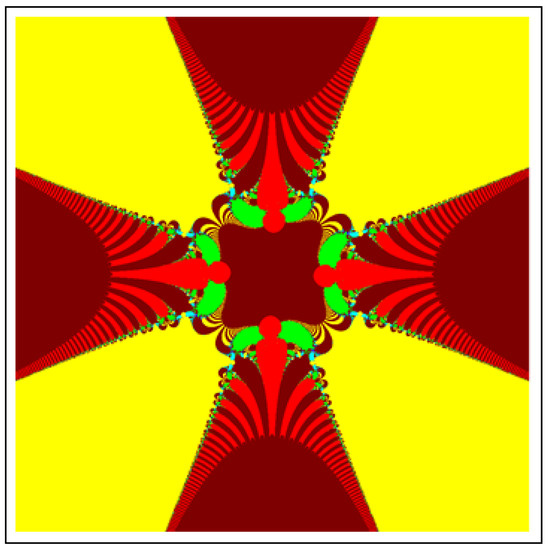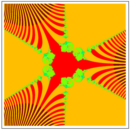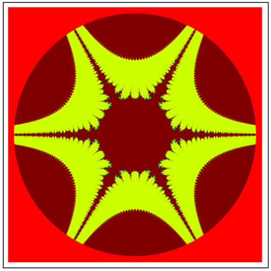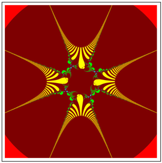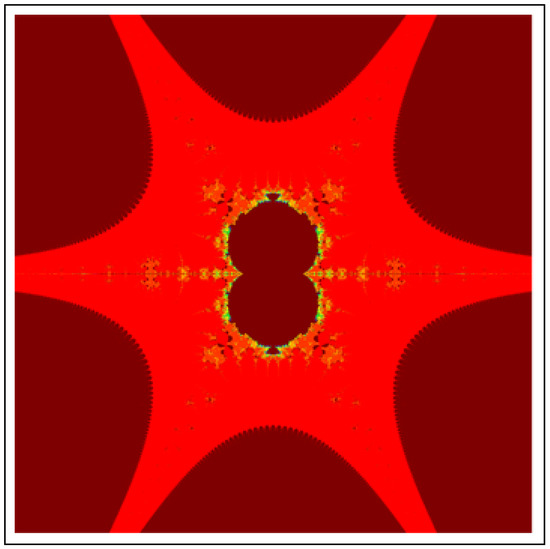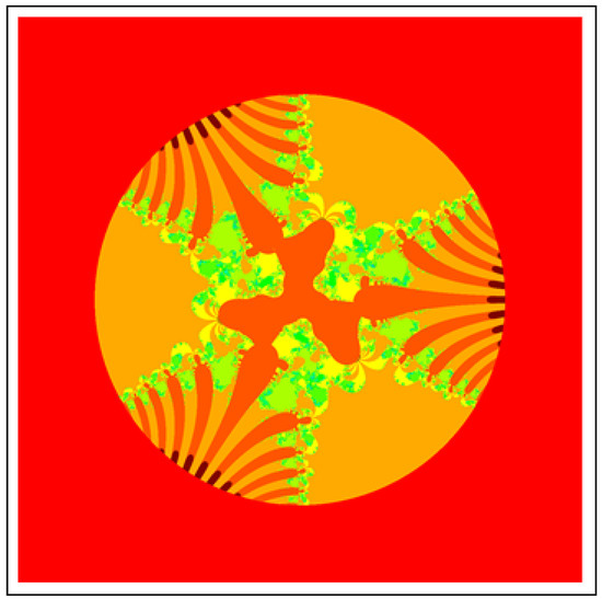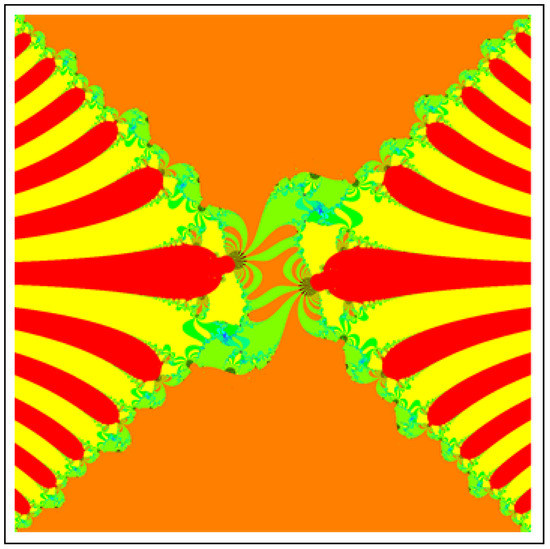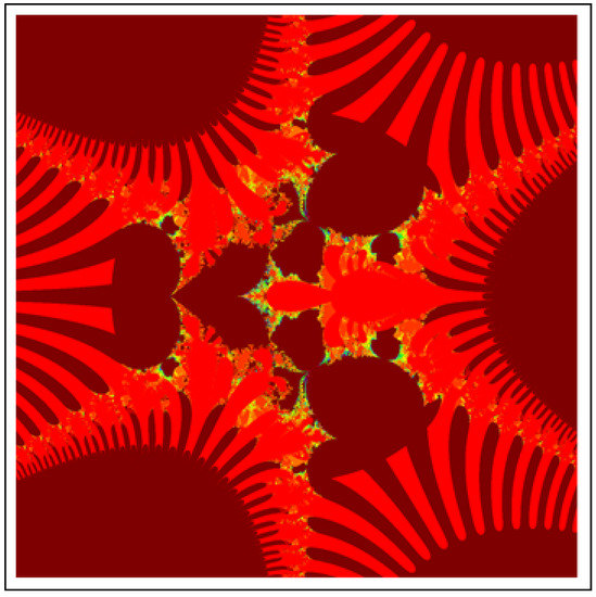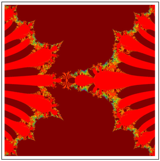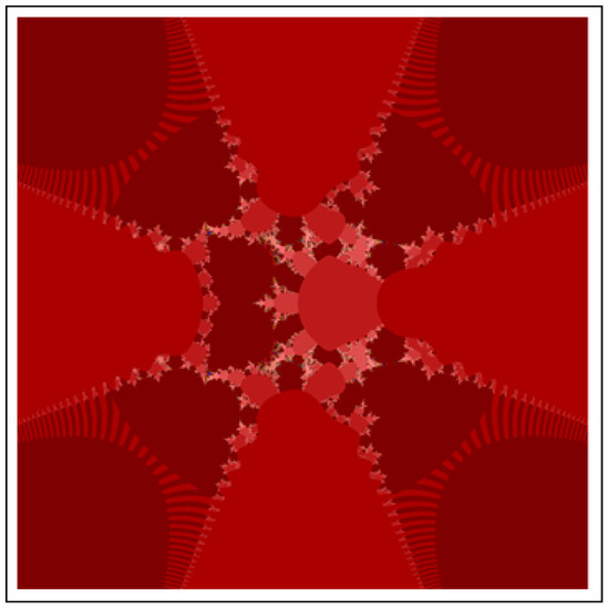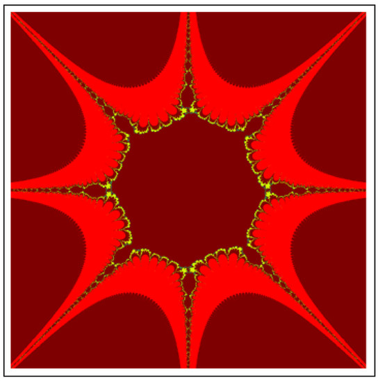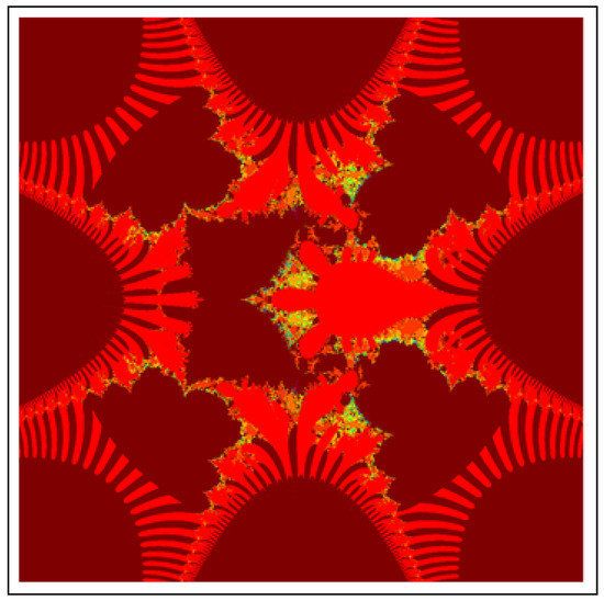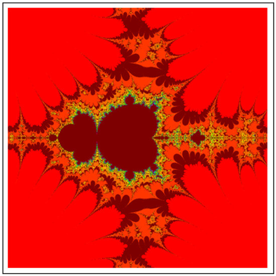 A fractal can be characterized as “a mathematical figure whose every point shows the same similarity as the entirety” or “an extremely irregular shape for which any appropriate focused part is like another larger or more modest part when amplified or diminished”. The word “fractal” is a Latin word that means broken or fractured. This terminology was first used by B. Mandelbrot [6] and later on he became famous as the “father of fractal geometry”. In the beginning of 20th century, P. Fatou and G. Julia tried to find the progressive estimate of where but they were unable to draw the graph of the proposed function. In 1985, B. Mandelbrot started work on this and successfully sketched the graph of complex function . He defined Mandelbrot set by changing the values of complex parameter b and variable x [7]. M-sets for where and are elaborated in [8]. The images like J-set and M-set using rational and transcendental complex functions are discussed in [9]. Later on anti J-sets and anti M-sets were defined by Crow et al. [10], and they generated graphs of where which are tri-corns.