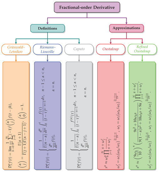 The three most frequently used definitions of fractional-order derivative for are Grünwald–Letnikov, Riemann–Liouville, and Caputo, as given in orange, blue, and grey coloured boxes of Figure 1, respectively. In the definitions, is Euler’s Gamma function. On the other hand, among the various approximation techniques available in the literature, Oustaloup’s technique is the most widely used frequency domain approximation method. The formula for computing the Oustaloup and refined Oustaloup approximations in red and green coloured boxes is in Figure 1. These approximation techniques are valid for estimating the order approximation of order within the lower and higher frequencies of and , respectively.