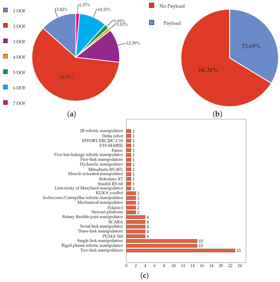 From the collected literature review in Table 1, a graphical trend analysis is made in this section. From the table, the summary of the manipulators’ trend is given in Figure 2. As shown in the figure, research has been conducted on various manipulators of DOF ranging from 1 to 7. However, most of the research on developing either fractional-order models or controllers has been conducted on 1, 2, and 3 DOF manipulators, with 2 DOF being the highest, around 60% (see Figure 2a). Moreover, as shown in Figure 2b, about 66% of research has been conducted on robotic manipulators without any payload, and only 34% work with a load. Further, it can be observed from Figure 2c that the research on developing either fractional-order models or controllers has been performed primarily on two-link, rigid planar, and single-link manipulators. It is also worth highlighting that research has been conducted on some industrial manipulators, including PUMA 560, SCARA, Polaris -I, Stewart platform, Staubli RX-60, Robotino-XT, Mitsubishi RV-4FL, KUKA youBot, Fanuc, ETS-MARSE, EFFORT-ERC20C-C10, Delta robot, differential-drive mobile robot [8] and University of Maryland manipulators.