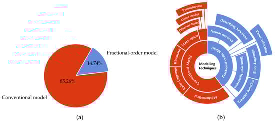Figure 3 gives a summary of the modelling approach and techniques used for robotic manipulators. As shown in Figure 3a, approximately 85% of modelling approaches used in the literature are conventional/integer-order type only. The remaining 15% of works have developed a fractional-order model of orders 0.3, 0.5, 0.6, 0.71, 0.8, 0.9, 0.92, 0.99, 1.14 and 3.04. Figure 3b shows that Euler–Lagrange relations have often been used to develop the manipulator’s dynamic model in the conventional model category. In the fractional-order model category, various approaches, including adaptive neural network, describing functions, value selection algorithm, the Bouc–Wen hysteresis model, and the Euler–Lagrange formulation, have been used to develop commensurate and non-commensurate fractional-order models of manipulators. The following section will give a more detailed review of these modelling stargates.