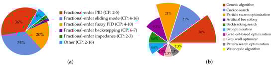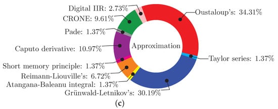 Summary of controller, optimization and approximation technique details from Table 1. (a) Fractional-order controllers. (b) Optimization techniques. (c) Approximation techniques.
