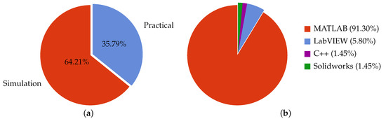 Figure 5 shows the summary of validation type and type of toolbox, collected from Table 1. Figure 5a shows that about 65% of works, either modelling or validating controller, have been performed in the simulation environment. At the same time, the remaining 35% of results have validated the proposed approaches, practically. For these validations, approximately 90% of the researchers have used MATLAB, while others used LabVIEW, C++, and Solidworks. It is also worth highlighting that several researchers have used externally developed MATLAB-based toolboxes such as CRONE, Ninteger, and FOMCON to realize fractional-order systems and controllers [7].