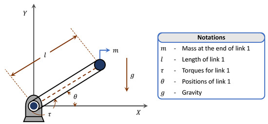 An ideal single-link planar rigid robotic manipulator is shown in Figure 6. The mathematical relationship between torque and position using Euler–Lagrangian formulation is given as [66,103,105],
