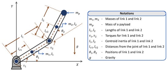 An ideal two-link planar rigid robotic manipulator or a SCARA-type manipulator with a payload of mass at the tip is shown in Figure 7. The mathematical relationship between torques (, ) and positions (, ) of both the links (1, 2) using Euler–Lagrangian formulation is given as [4,5,28,31,39,44,51,64,103,106,107],
