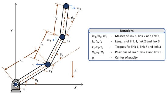 An ideal three-link planar rigid robotic manipulator with no friction, as shown in Figure 8, is where all the masses , and exist as a point mass at the end point of each link. The mathematical relationship between torques (, , ) and positions (, , ) of all the links (1, 2, 3) using Euler–Lagrangian formulation is given as [56,65],