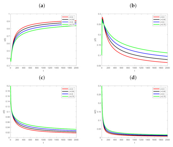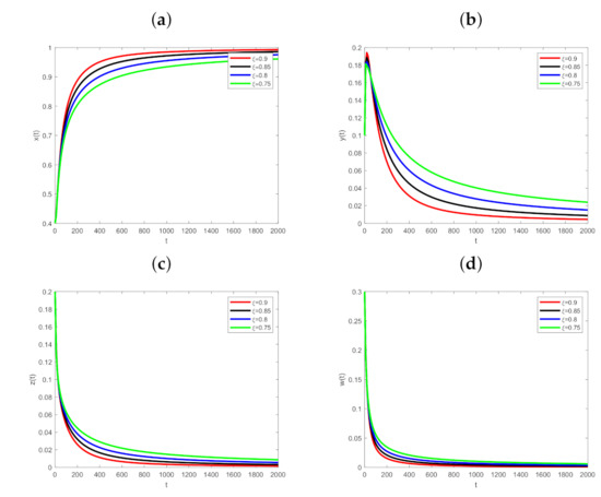 Graphs for the numerical solution of the fractional-order model investigated in this work. The graphs were obtained using the numerical method introduced in the previous section, and they provide the dynamics of (a) x vs. t, (b) y vs. t, (c) z vs. t, and (d) w vs. t. The parameters employed to produce these simulations were those provided in Table 1 for the endemic case. As indicated by the legends, various differentiation orders were employed.