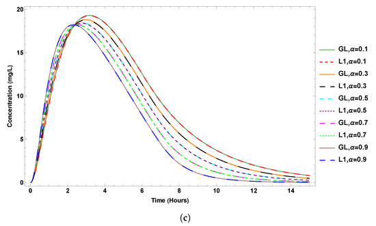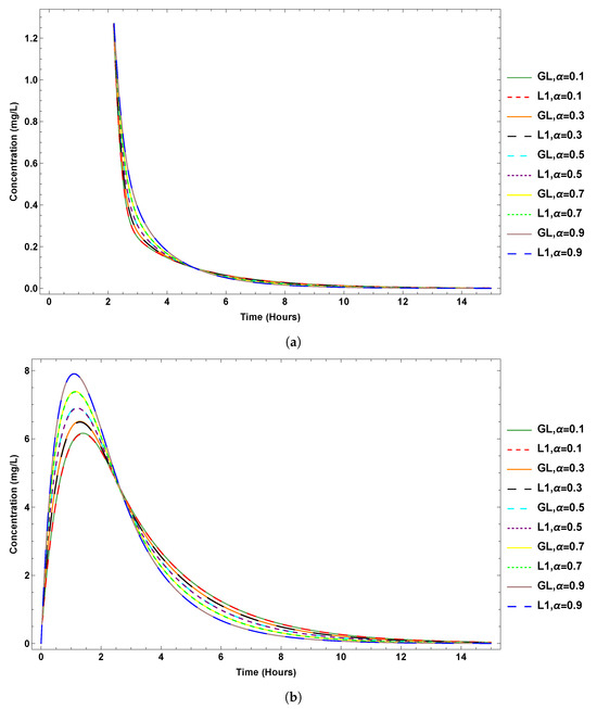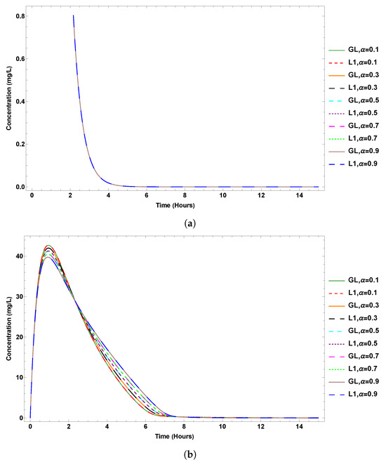 The oral administration route’s central compartment depends on the gut’s flux. However, oral drug bio-availability can easily be influenced by physiological factors, such as the gastrointestinal pH, gastric emptying, small intestinal transit time, and bile salt absorption mechanism [22]. The numerical schemes in the central compartment concentration are similar even though they have different concentration levels, as seen in Figure 3b. Further, Figure 3b indicates that the concentration descends faster for lower fractional order values of . This suggests that the drug’s excretion or elimination occurs for the intravenous bolus model. Moreover, we can see the excellent agreement between the two numerical methods seen in Figure 3.